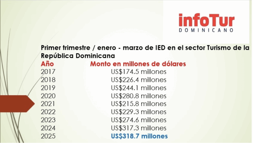 La Inversión Extranjera Directa (IED), en la República Dominicana en el primer trimestre, presenta un incremento en relación a los tres primeros meses del 2024, de acuerdo a la información recabada por Infotur Dominicano en base a la data suministrada por el Banco Central y en el que los sectores de Energía y Turismo lideran como principales sectores receptores de la IED.