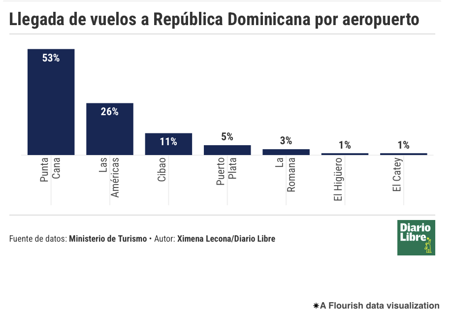 Punta Cana fue el aeropuerto con mayor volumen de llegadas durante este período. Por esta terminal ingresó el 63 % del total de turistas, equivalente a 2,845,622 personas.